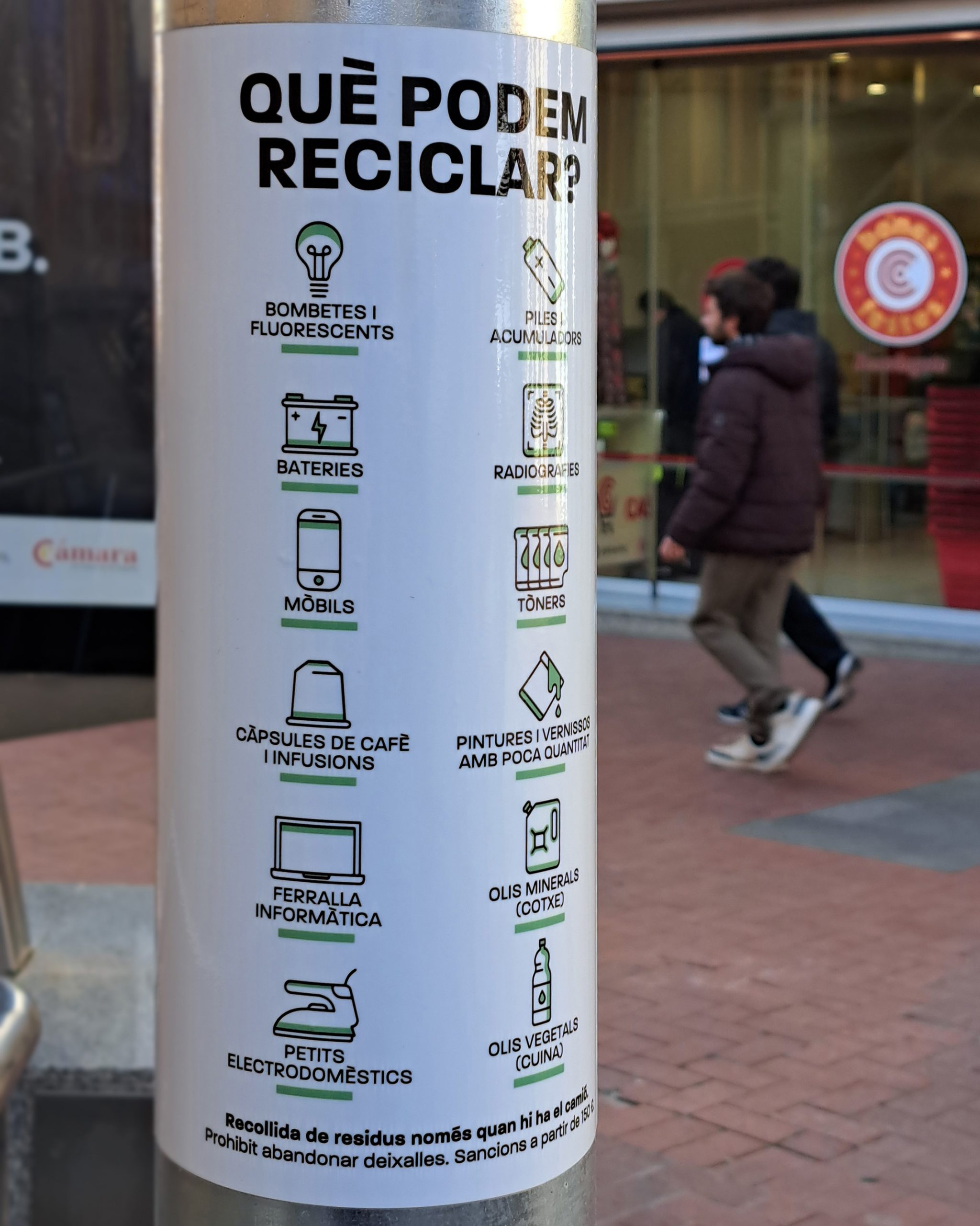 Hem conceptualitzat el conjunt de parades que s’estenen per tota la ciutat, creant punts de referència visuals clars i propers per a la ciutadania. El projecte es completa amb un tríptic informatiu dissenyat per fer que l’experiència del reciclatge sigui tan intuïtiva com accessible.